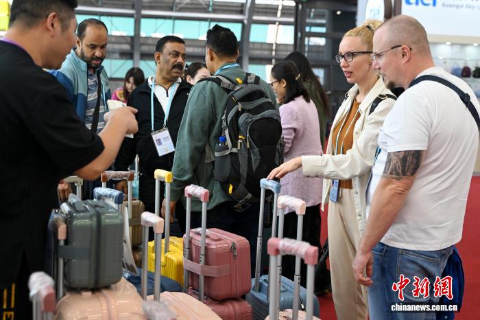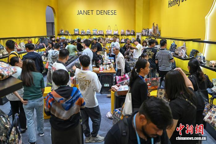 图为境中推销商正在广接会箱包铺区取参铺协商道。中新社记者 旧骥旻 摄