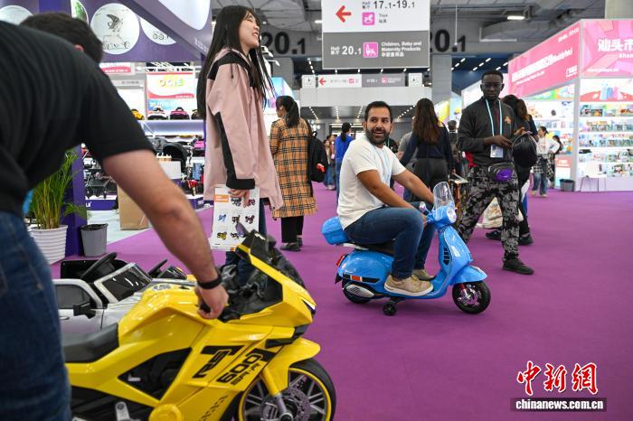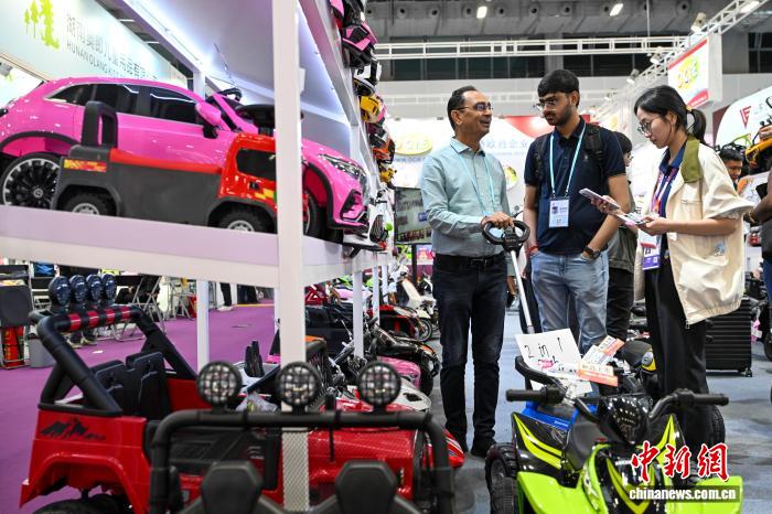 图为境中推销商正在广接会玩物铺区取参铺谈判道。中新社记者 旧骥旻 摄